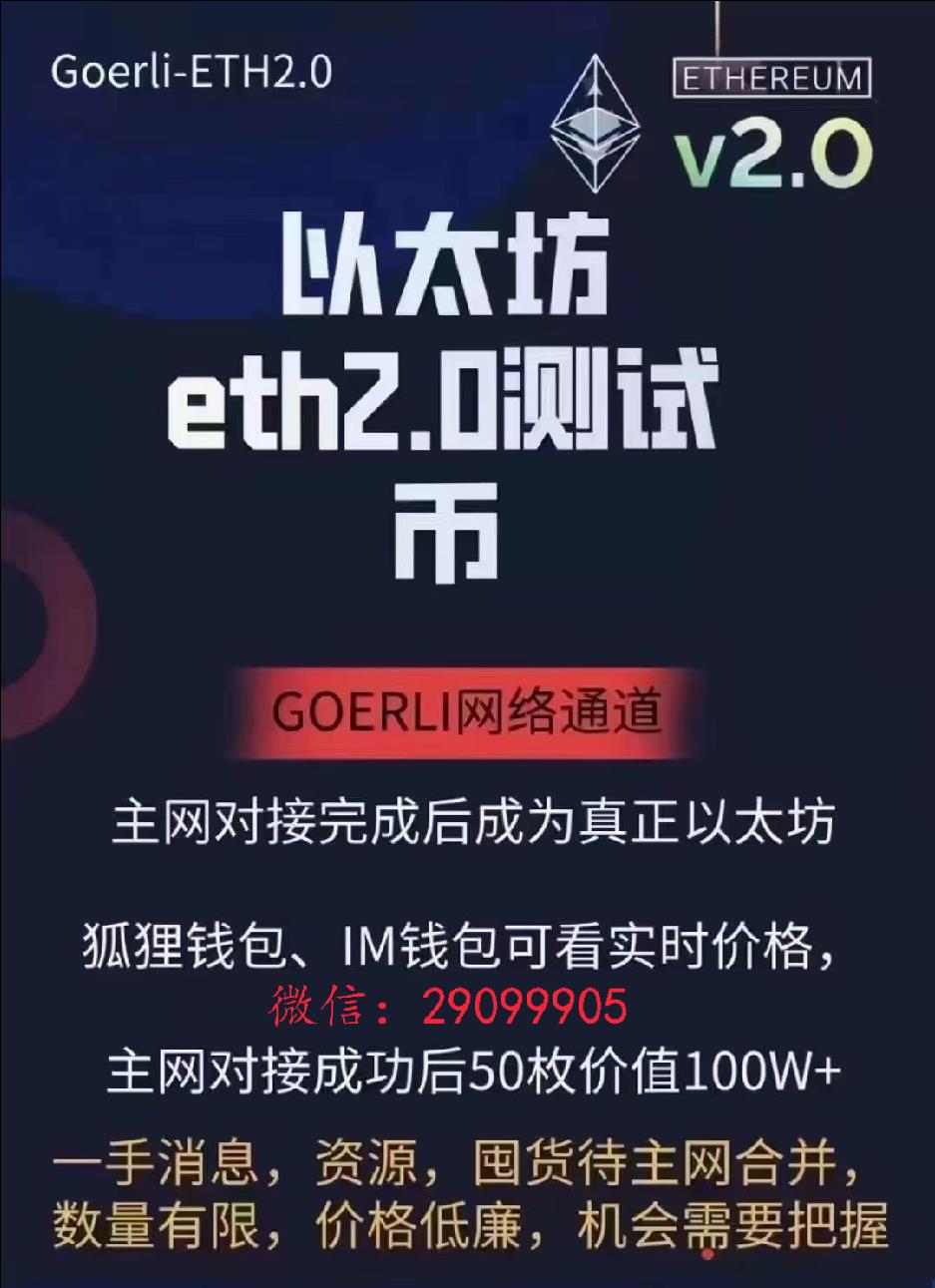 目前除了几个机构以外,没有多少人知道这个资讯资源,总共给到市场的量超过50万枚,所以知道,抢到,得到,就是赚到,综合所上,投资以太坊2.0用币,大势所趋,势在必然,切勿错过良机!《以太坊历史性机遇再现》当初你错过ETH以太坊1.0,这次不要错过ETH以太坊2.0测试币,根据手头上的资金做一个合理的资产配置,所谓试错的成本不高,错过的成本很高,如果囤不了几千个,哪怕囤个几百个也很好!